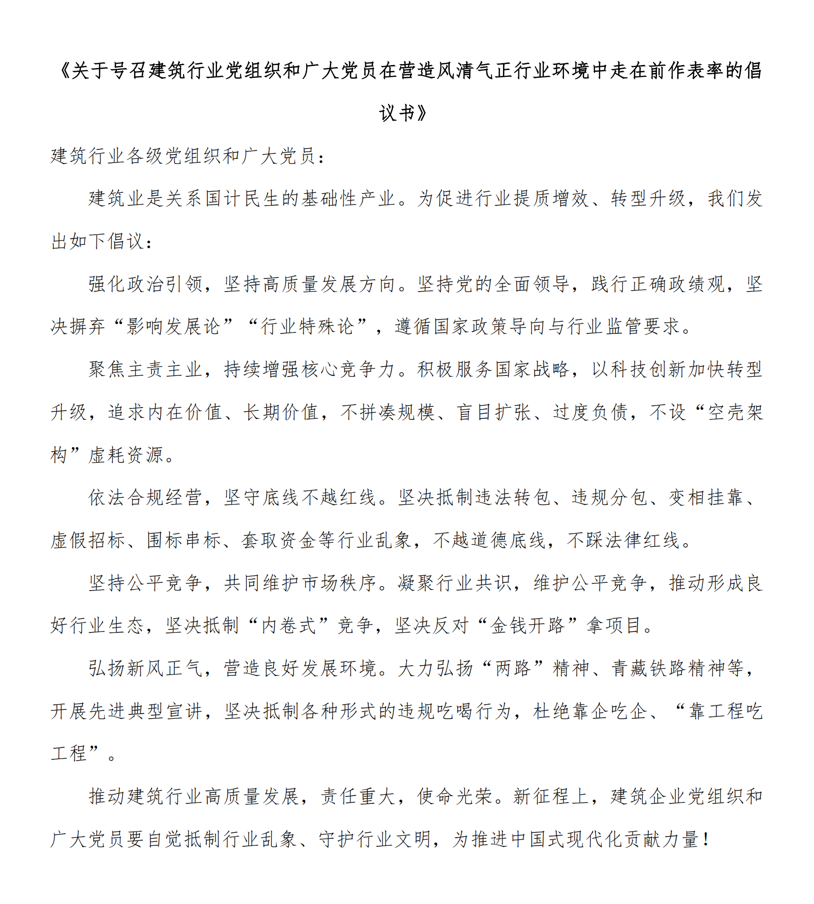 關(guān)于號召建筑行業(yè)黨組織和廣大黨員在營造風(fēng)清氣正行業(yè)環(huán)境中走在前作表率的倡議書