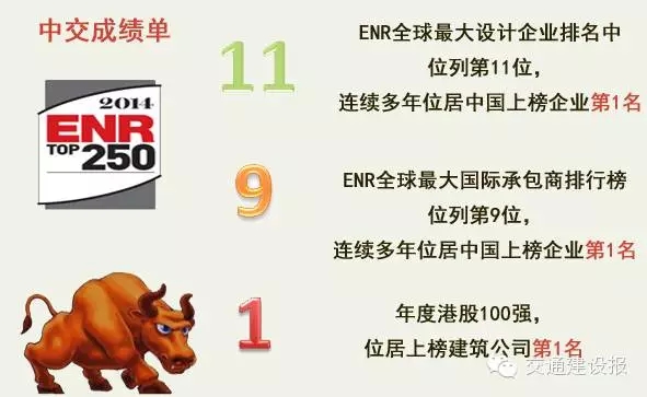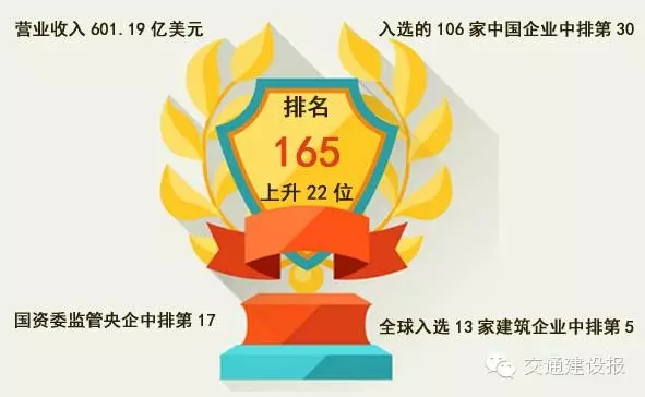 7月22日,美國《財富》雜志公布了2015年世界500強排行榜,中國交建以601.19億美元的營業(yè)收入位列第165位,比去年的第187位上升了22位,在入選世界范圍內(nèi)的13家建筑類企業(yè)中,排名第5位,利潤額在國內(nèi)建筑企業(yè)中,排名第2位。中國交建穩(wěn)固了公司“十二五”規(guī)劃制定的進入世界500強前200名的戰(zhàn)略目標,續(xù)保持在世界500強的前列;在入選的106家中國企業(yè)(包括香港、臺灣)中排名第30位,在國務院國資委監(jiān)管的中央企業(yè)中排名第17位。